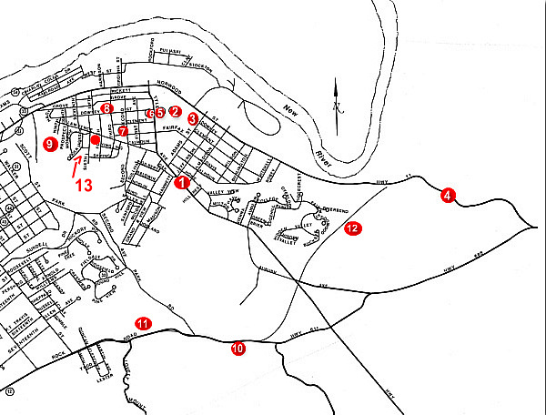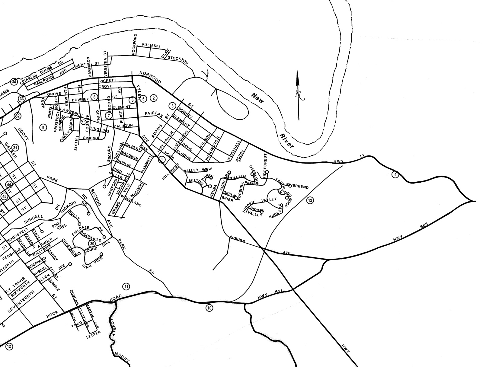 The East Radford Tour has twelve (12) stops. Each stop is marked on the map by a number. A full description of each stop is shown below with the corresponding number. You can easily use this map in two ways: